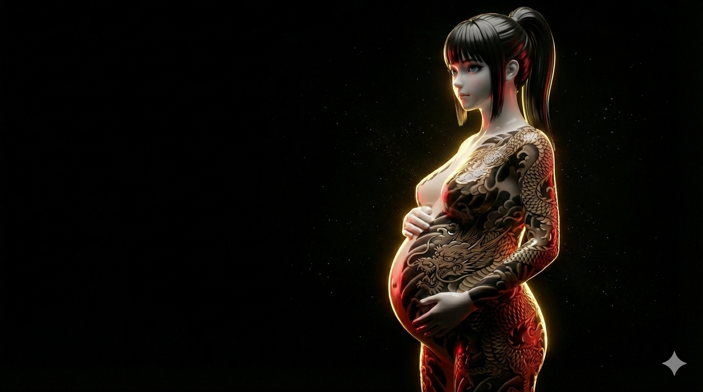 Sheer Curtain — Silhouette of Pregnant Woman with Dragon Tattoo